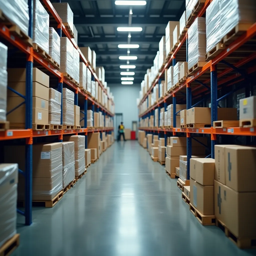 Magazzino industriale con pallet avvolti nel film plastico e scatole di cartone impilate in altezza